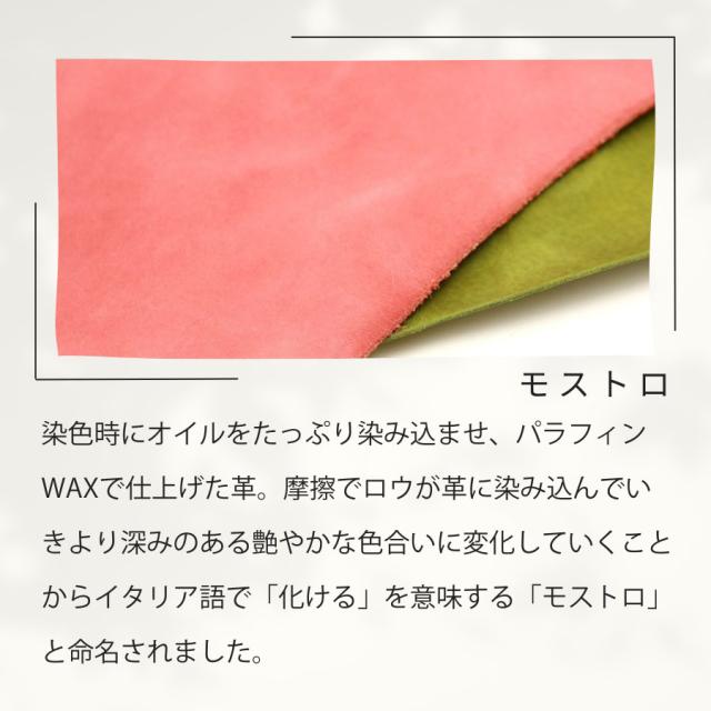 染色時にオイルをたっぷり染み込ませ、パラフィンWAXで仕上げた革。摩擦でロウが革に染み込んでいき、より深みのある艶やかな色合いに変化していくことから、イタリア語で「化ける」を意味する「モストロ」と命名された姫路で加工された革です。