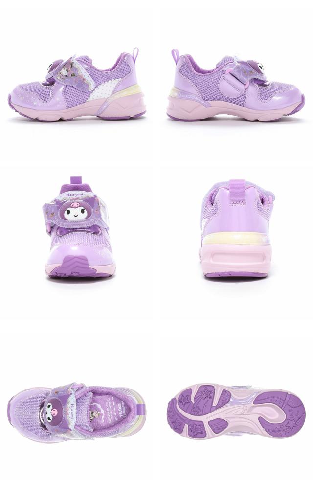 サンリオのLEDキッズシューズです。ワンタッチで脱ぎ履きできる一本バンドのジョグタイプです。通園をはじめ、外遊びや運動、お出かけなど、マルチに履いていただけます。ピンクは「ハローキティ」、ミントは「シナモロール」、パープルは「クロミ」です。甲バンドのキャラクターのパーツが振動によって光ります。発光回数の目安は約30万回、およそ2か月光ります。リボンやドットが可愛いロリータ系デザインです。アッパーのキラキラメッシュや、中敷のキャラクタープリントなど可愛いがたくさん詰まった一足です。中敷きには「Ag+抗菌防臭」を搭載しています。