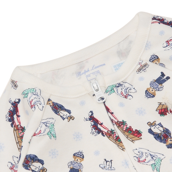 RALPH LAUREN(ポロラルフローレン)のベビー服が入荷しました☆アイコニックなベアのモチーフを全体にあしらったカバーオール。胸元にはさりげなくブランドのロゴ刺繍を添えて高級感をアップさせました。フロントは裾までジップ開きになっており、簡単に着脱が出来る便利な仕様です。足先までをしっかりとカバーし、冷気から守ります。