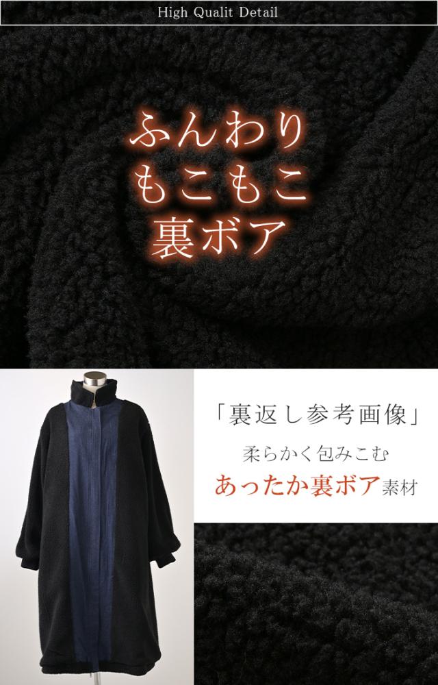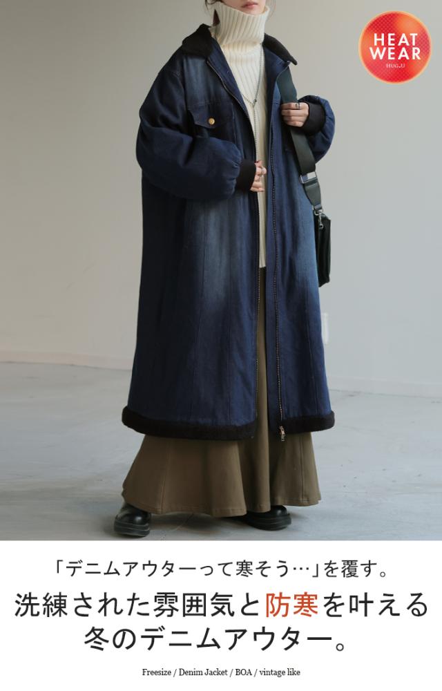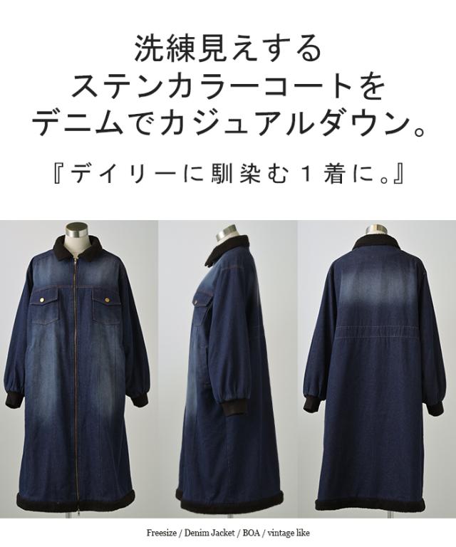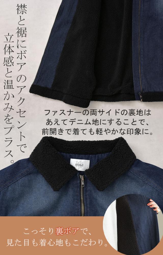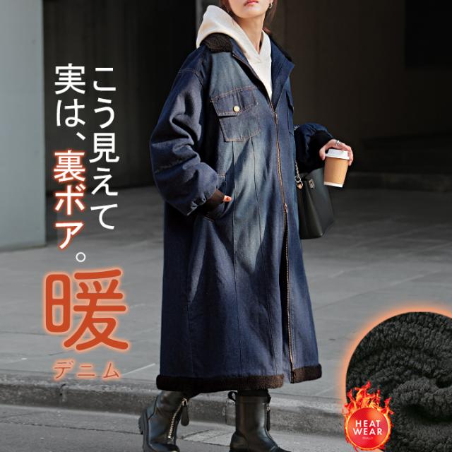 コート デニム 裏 ボア レディース アウター 無地 長袖 ステンカラー ステンカラーコート ボアアウター ロング ロングコート ジャケット 裏起毛 デニムジャケット Gジャン ダブルジップ オーバー あったか 防寒 カジュアル ネイビー 紺 秋 冬 HUG.U 秋新作