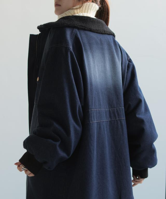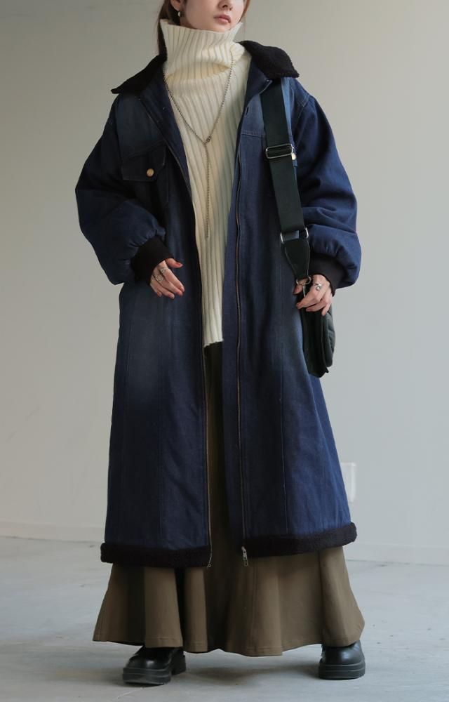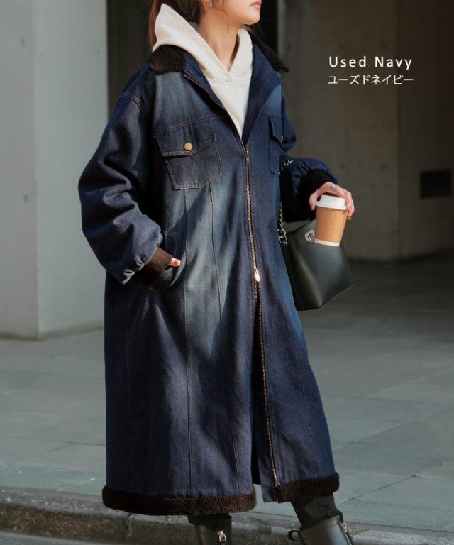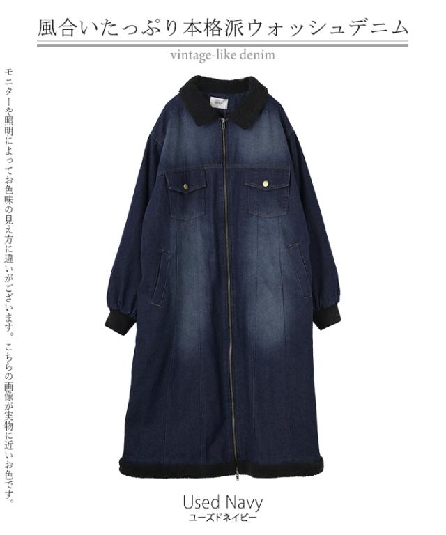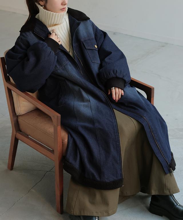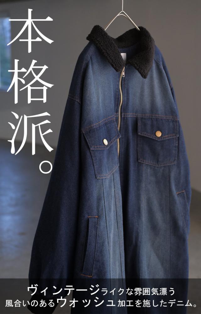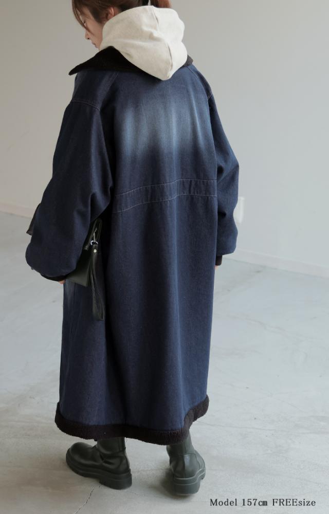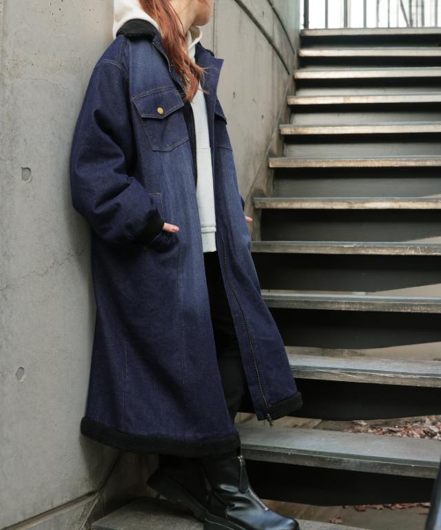 ヴィンテージ感の雰囲気ある裏ボア使いのロングデニムコートです。