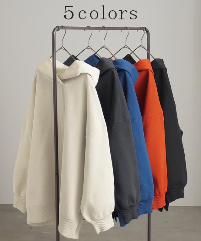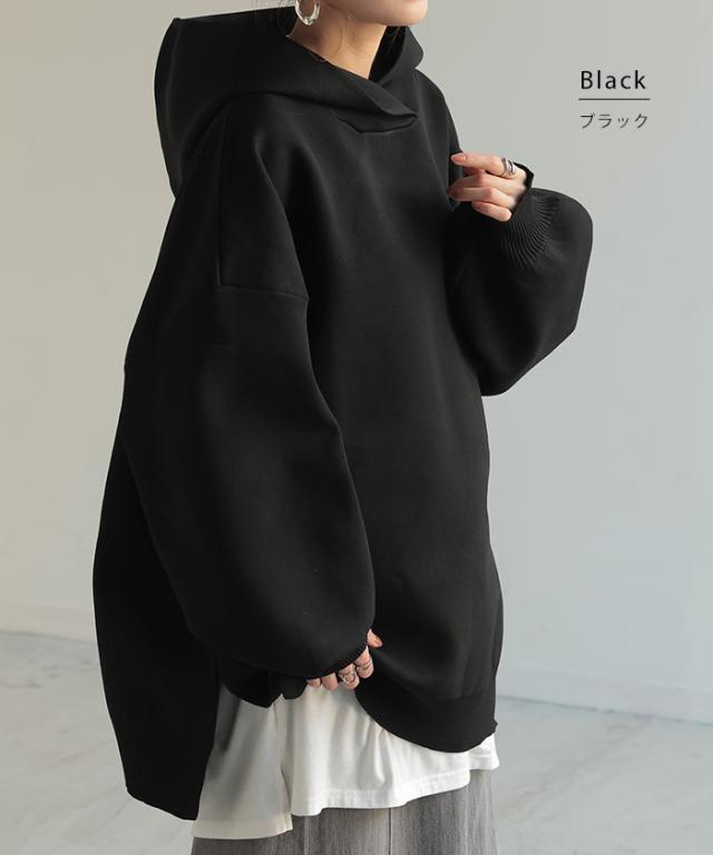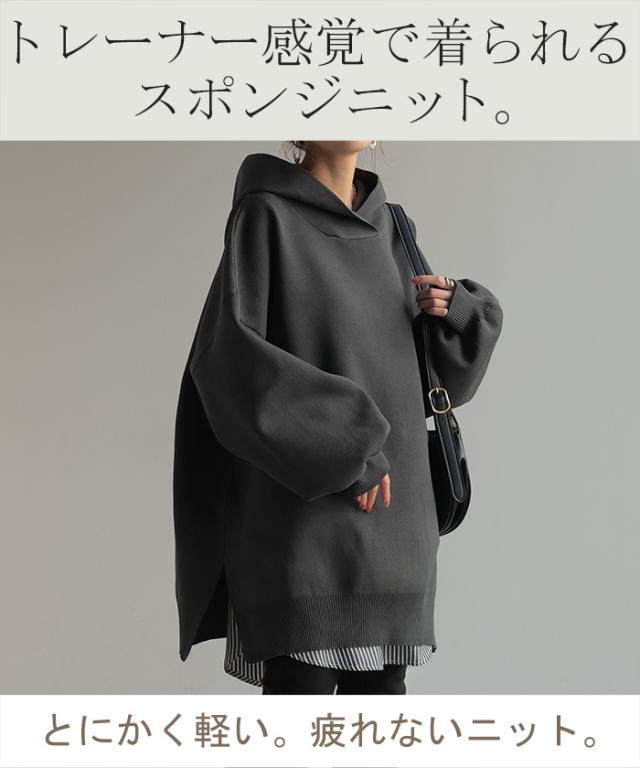 パーカー スポンジニット ニットパーカー ニット スポーティー 一部3月中旬入荷 レディース ライトアウター トップス プルオーバー フード フーディー ビッグ ドルマン ゆったり オーバーサイズ チュニック 体型カバー 大きいサイズ お尻が隠れる 黒 秋 冬 HUG.U 秋新作