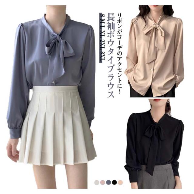 リボン シフォン ボウタイブラウス ブラウス 長袖 ボウタイ付き フォーマル 卒業式 ボリューム袖 春 秋冬 オフィス シャツ OL 入学式 トップス ブラウス 無地 とろみ 通勤 ママ 母 大きいサイズ 体型カバー 着?せ 送料無料