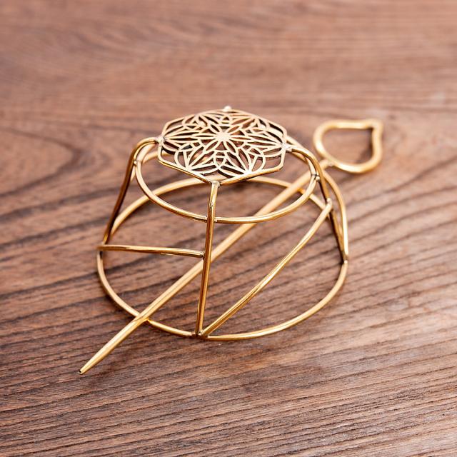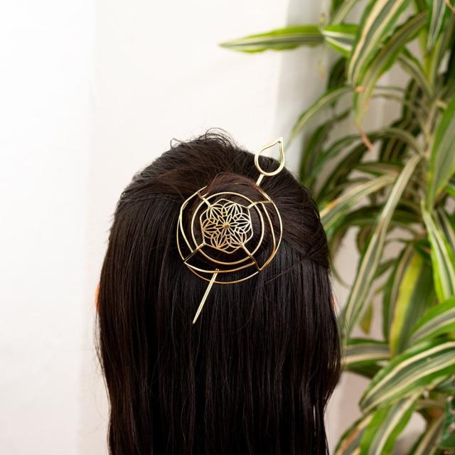 インドからお団子ヘアをオリエンタルに仕上げるヘアアクセがやってきました。お団子ヘアといえばかんざしをさしたり、シュシュでくくったり、かわいいピンを刺して仕上げるものが多い中、なんとこちらはカポっとお団子を丸ごと覆うスタイル!珍しい!程よい大きさのお団子を作り、お団子部分に被せたら付属のかんざしをさせばOK!どんな髪の色や髪型でもお似合いですよ。