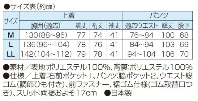 ●仕様/上着:右前ポケット1、パンツ:脇ポケット2、ウエスト総ゴム(調節ひも付き)、前ファスナー、裾ゴム仕様(ゴム取替口つき)、スリット:両裾およそ17cm
