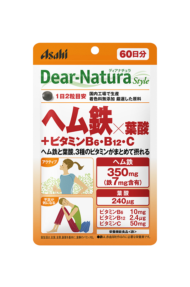 | 毎日をアクティブに過ごしたい方に ヘム鉄×葉酸+ビタミンB6・B12・C 120粒(60日分) アサヒ ディアナチュラ スタイル 栄養機能食品 鉄 ヘム鉄350mg(鉄7mg含有) 葉酸240μg ビタミンB6 10mg ビタミンB12 2.4μg ビタミンC 50mg 着色料無添加 |