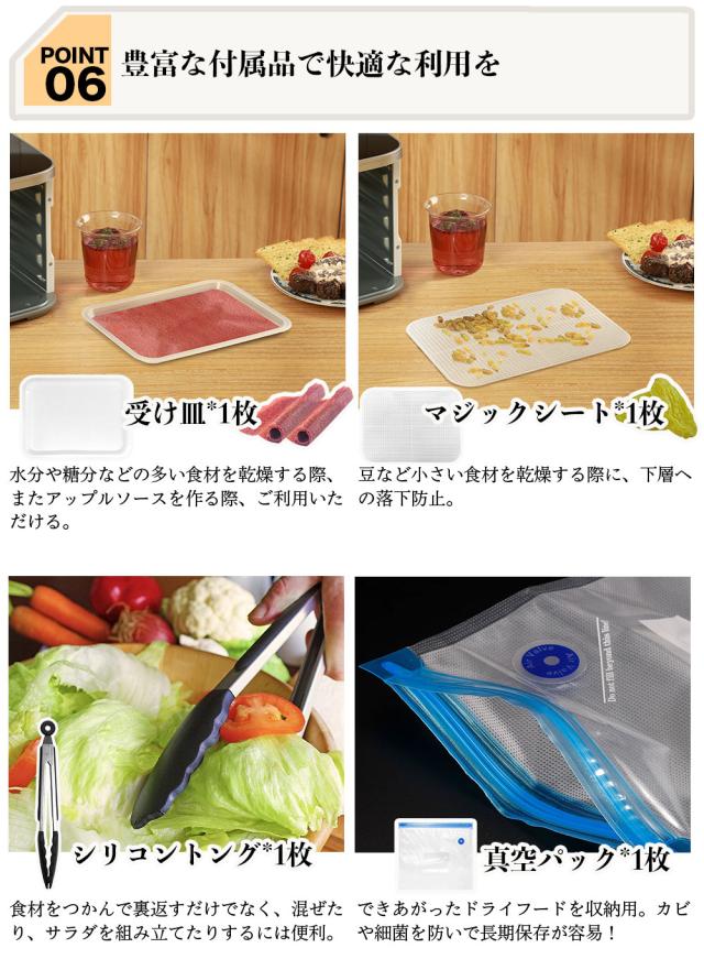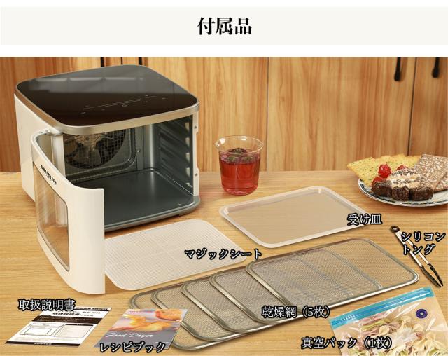 付属品 本体、304ステンレストレイ×5 水受け皿*1、取扱説明書、レシピブック、マジックシート1枚、シリコントング1枚、真空パック1枚