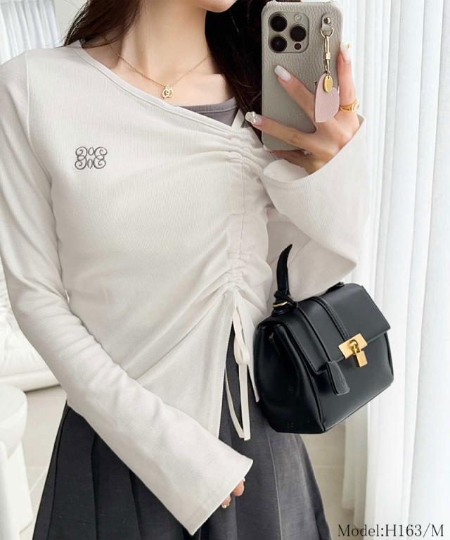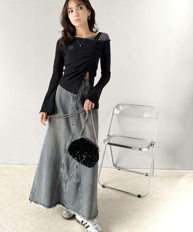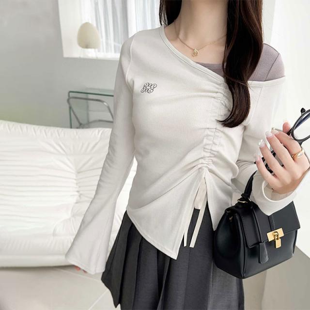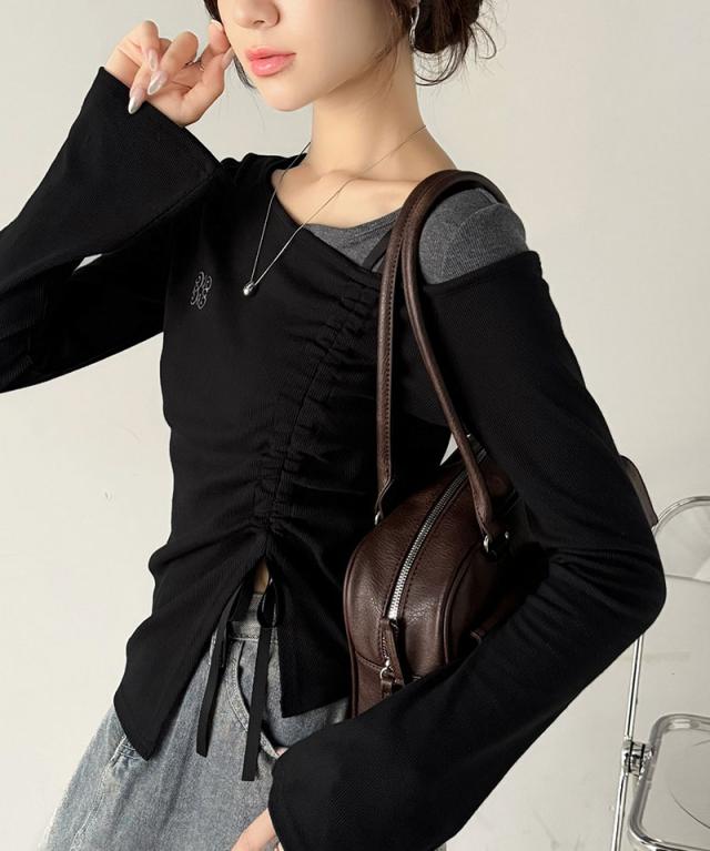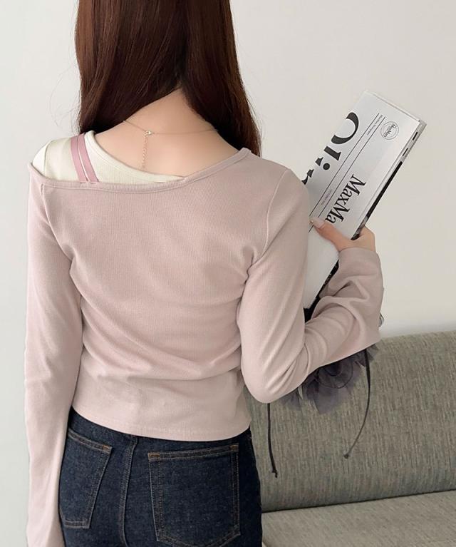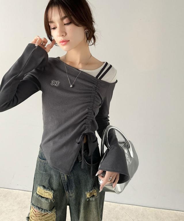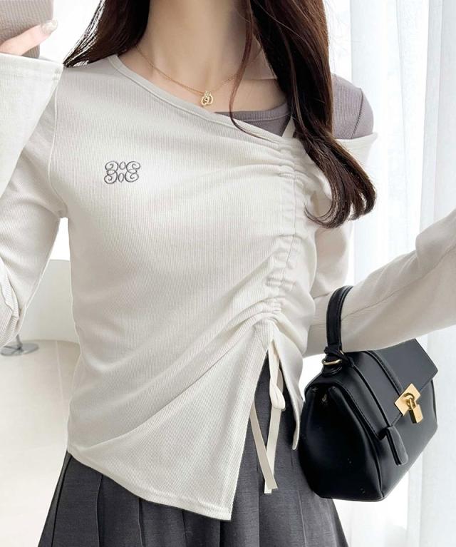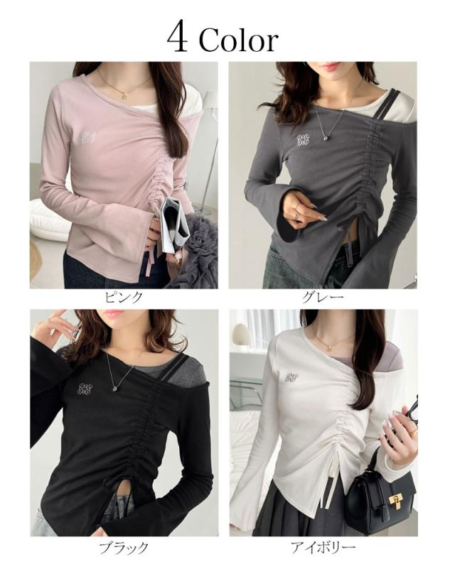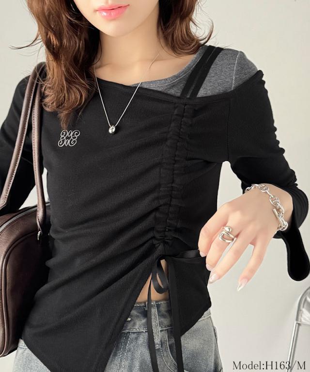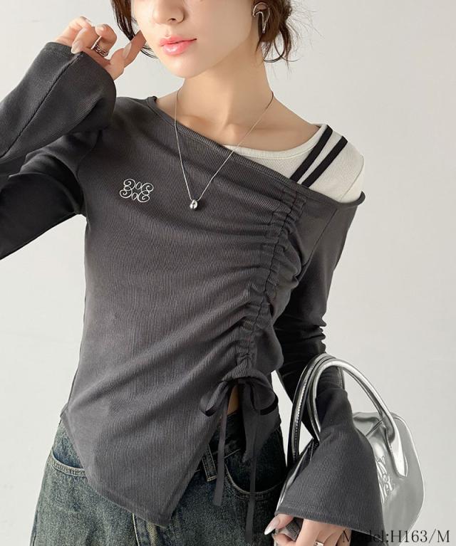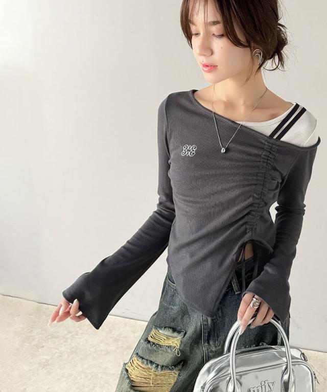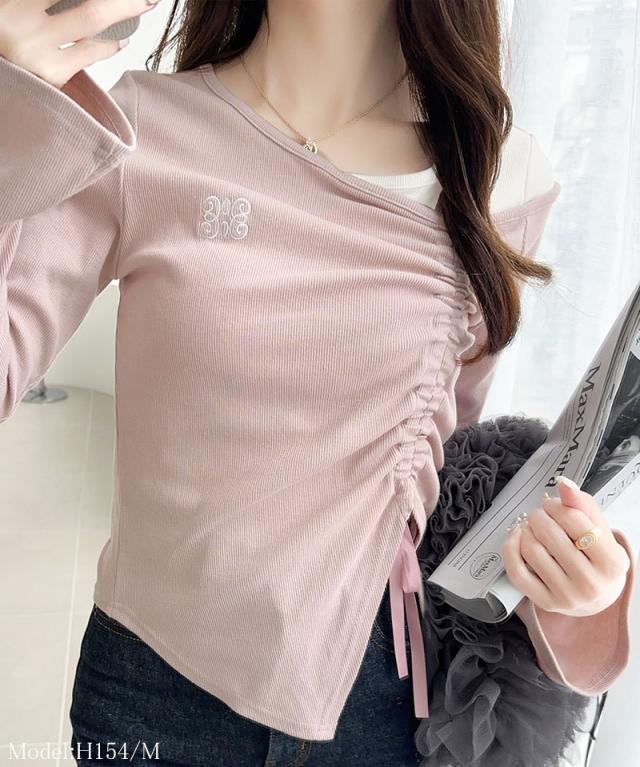 ★【mily bilet】アシメネックレイヤード風シャーリング使い袖フレア胸刺繍カットソー(長袖)★