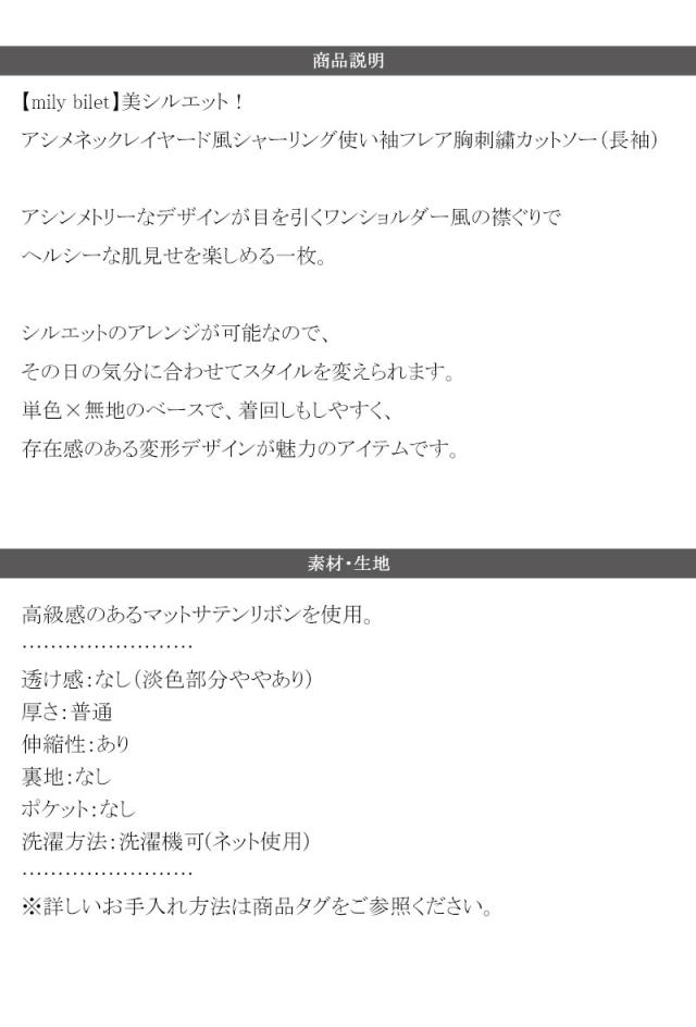 クラシカルエルフ冬新作 mily bilet トップス Tシャツ レディース アシンメトリー ネック レイヤード 風 シャーリング 使い 袖 フレア 胸 刺繍 カットソー 長袖 大きいサイズ 2024aw mi1359011