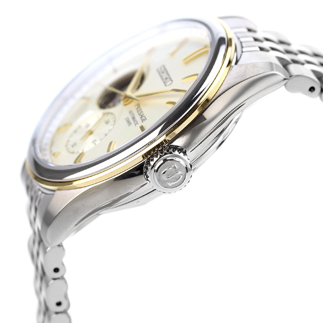 正規品 7年保証キャンペーン 送料無料 セイコー プレザージュ 素色 コアショップ専用モデル 流通限定モデル オープンハート 日本製 メンズ 腕時計 SARJ010 SEIKO PRESAGE Classic Series アナログ オフホワイト 白 ◆日本のものづくりに込められた伝統的な感性と洗練されたエレガンスを備えた、正統かつ普遍的なウオッチコレクション「クラシックシリーズ」から新モデルが登場。ダイヤルカラーは古来より愛されてきた和服の染色の伝統色の一つである、生地の素材そのものの色を表す素色を採用。更に高貴さや神聖さを象徴し、祝い事の際にも使用されることの多い、金色を取り入れることで、エレガントかつクラシックなケース造形を一層際立たせます。ダイヤルはクラシックな雰囲気を演出するため立体的に成形したダイヤルを採用。針やインデックスをダイヤルの曲面に合わせてカーブさせることで、ダイヤル全体が柔らかな光で輝きます。 発売日:2025年1月発売 機械式腕時計