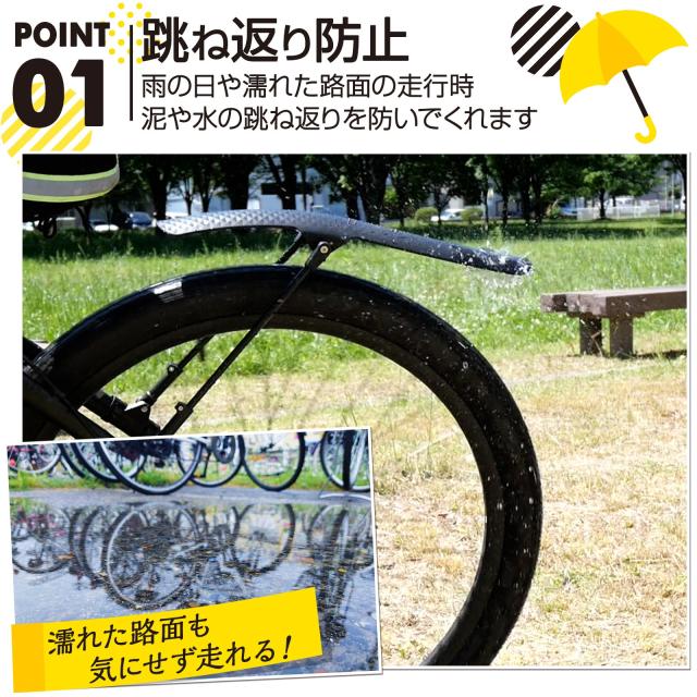 雨の日やぬれた路面の走行時、泥や水の跳ね返りを防いでくれます。