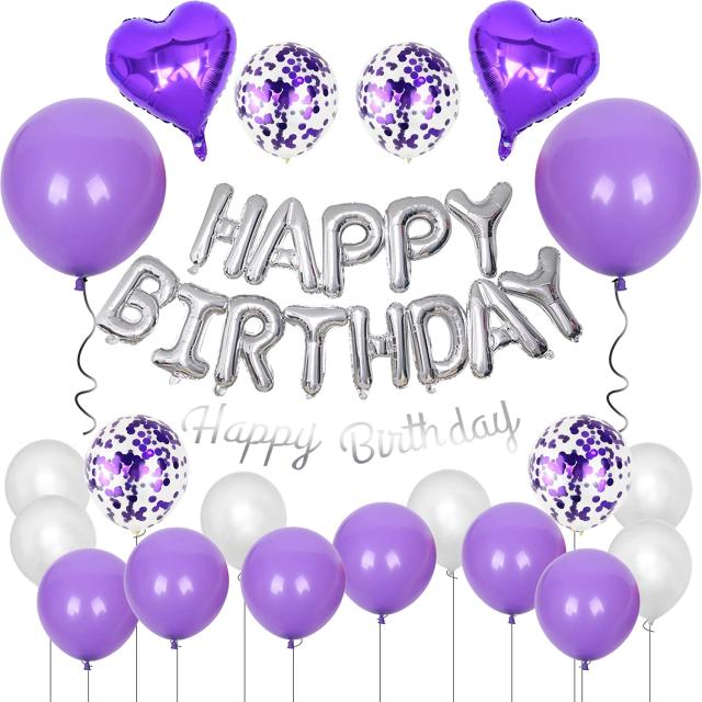 GRESATEK 誕生日 バルーン飾り付けセット ハッピー バースデー HAPPY BIRTHDAY ハート 紙吹雪風船 両面テープ リボン付き パープル