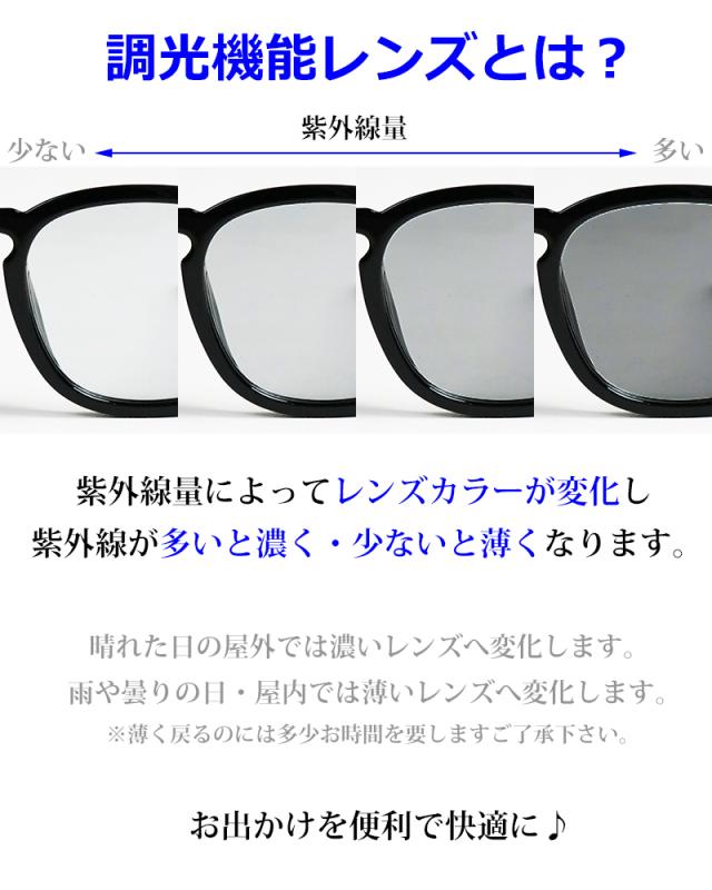レンズが紫外線に反応し、太陽光/紫外線の強弱に応じてレンズの色が変化する”調光機能レンズ”