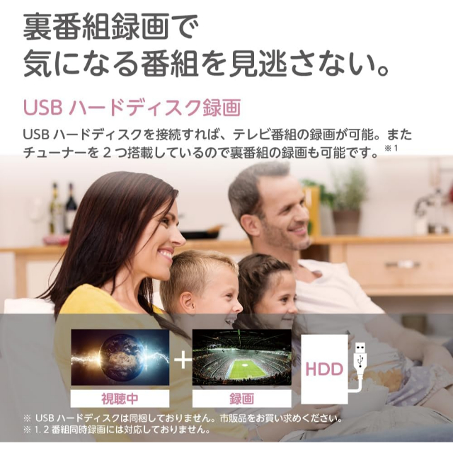 USBハードディスクを接続すれば、テレビ番組の録画が可能。またチューナーを2 つ搭載しているので裏番組の録画も可能です。