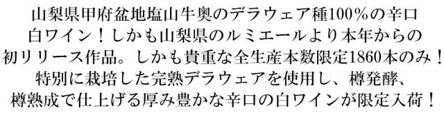 山梨県甲府盆地塩山牛奥のデラウェア種100%の辛口白ワイン!しかも山梨県のルミエール より本年からの初リリース作品。しかも貴重な全生産本数限定1860本のみ!特別に栽培した完熟デラウェアを使用し、樽発酵、樽熟成で仕上げる厚み豊かな辛口の白ワインが限定入荷!