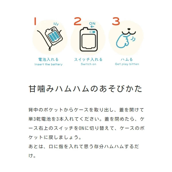 あまーく、かまれる、新体験。 子育ての思い出から生まれた、ユカイ工学の新しい癒やしの形。 赤ちゃんや幼いペットの短い期間にしか体験できない 幸せなしぐさを再現した甘噛みロボットです。 心地いいけれど、止めさせないといけない。 そんな魅惑の「甘噛み」をいつでも味わうことができます。 ■電源 単 3 形乾電池 3 本 (電池別売り) ※アルカリ電池推奨 ■使用可能電池 アルカリ電池、ニッケル水素充電池 ■外形寸法(しっぽ込み) W145mm × H200mm × D145mm ■重量 約 380 g ■動作環境 温度+10℃ 〜 +35℃ 湿度+20% 〜 +80% ■素材 ぬいぐるみ:ポリエステル、ポリウレタン ハムリングシステム:POM 電池ボックス:ABS ■型番 YE-HM001MR ※記載は商品仕様の一部です。仕様説明不足等の理由での返品はできません。特に適合等は必ずご確認ください。