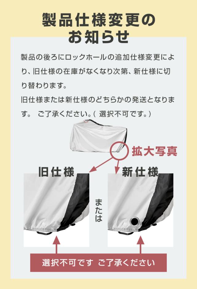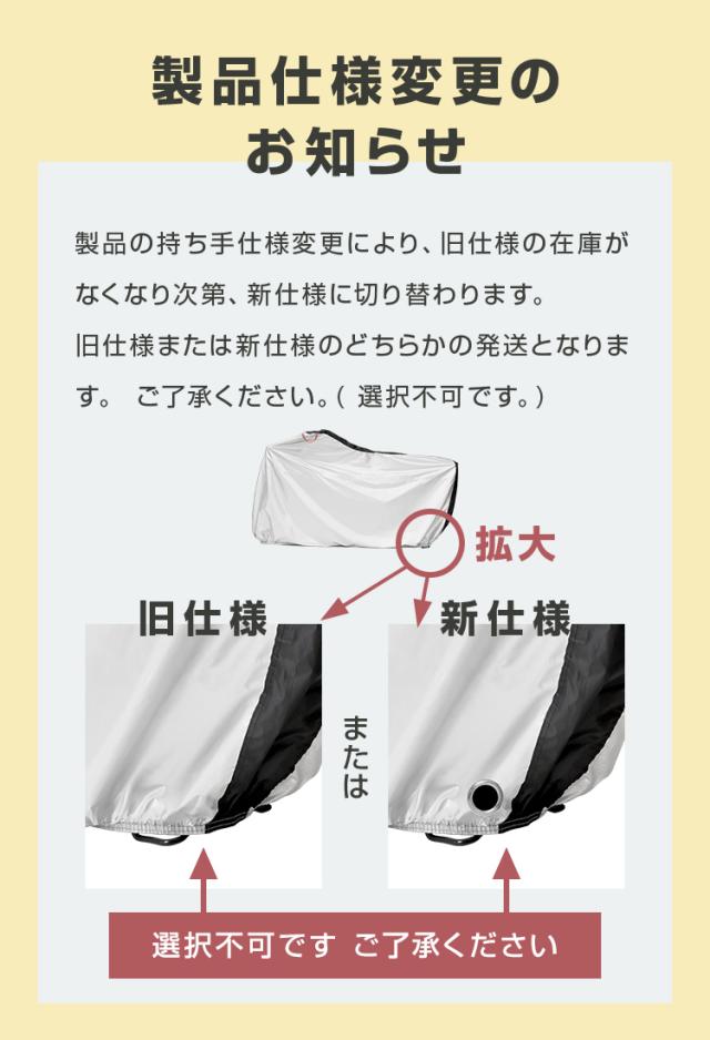 ・撥水性素材ですが、完全防水ではありません。長時間の雨など状況によっては、水気が浸透する可能性があります。 ・被せ式なので、地面からの跳ね返りによる蒸れは 発生します。 ・脱着時、ハンドル・ペダル・ステップなどと擦れると破れの原因となりますのでご注意ください。 ・強風・台風時など、風によって擦れが発生しやすい状況下の場合は、破れる可能性があります。 ・撥水性の保持期間については、利用環境により異なりますが、徐々に低下していきます。 ・日中紫外線を浴び続けるような環境下では、劣化速度が早まります。 ・半永久的に使用できる製品ではありませんのでご了承の上、ご使用ください。 ・鋭利な突起物等で突いたりひっかいたりしないようにご注意ください。 ・入荷時期により予告無くデザインや色やサイズなど、細かな仕様が変更される場合がございます。 ・輸入品につき傷やスレなどがある場合がございます。ご了承下さい。 ・輸入品の為、外箱はありません。ご了承下さい。 ・商品は、モニターによって色合いが異なって見える場合があります。 |