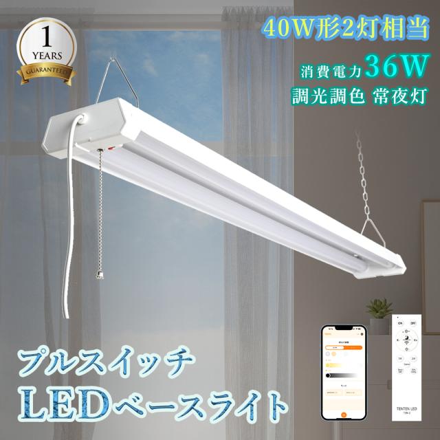 逆富士型 LEDベースライト調光 調色 40W形 2灯相当 吊り下げ プルスイッチ付き スマートライト 消費電力36W 7200? 長寿命 リモコン付き アプリ操作 ちらつきなし 天井直付型 直管蛍光灯 常夜灯 蛍光灯器具一体型 キッチンベースライト タイマー 記憶機能