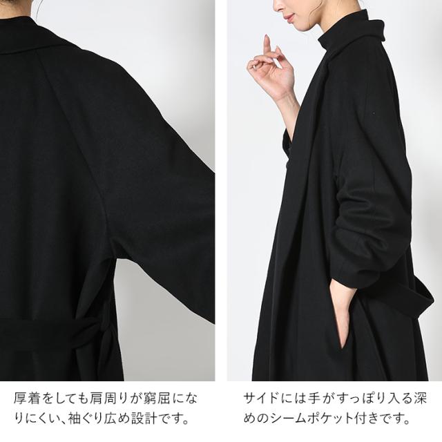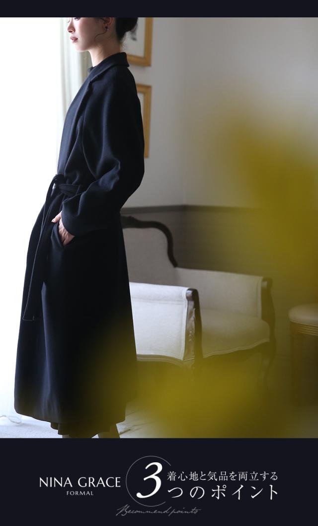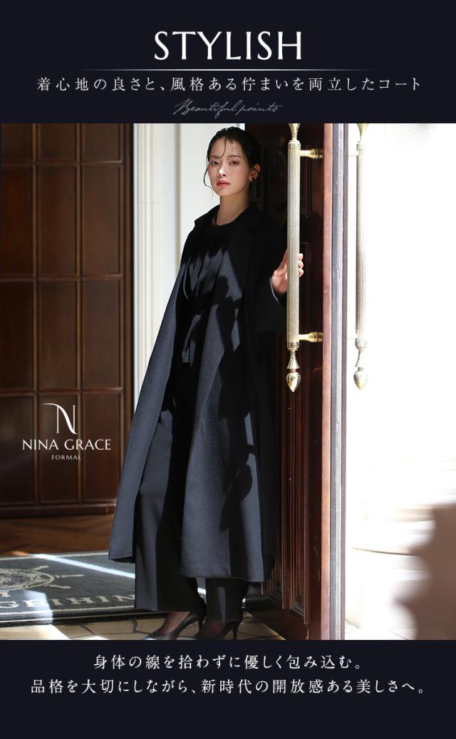 ・【NINA GRACE】ゆったりと羽織れる大人のロングガウンコート。生地に高級ウールをブレンドすることで、真冬も過ごせる暖かさ・ふんわり柔らかな肌ざわりと耐久性の高さを両立しています。