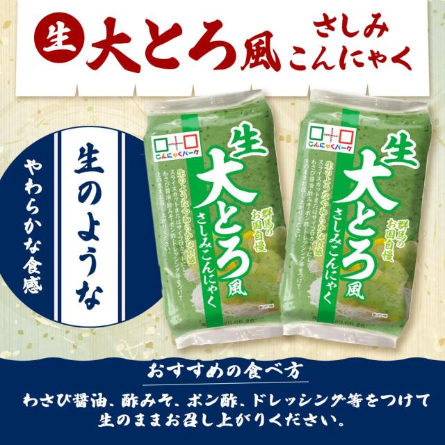 | こんにゃくパーク独自の製法で生大とろ風に造り上げた生のようなやわらかな食感のさしみこんにゃくです。スライスカットまたはサイコロカットにして、わさび醤油、酢みそ、ポン酢、ドレッシング等をつけて生のままお召し上がりください。 |