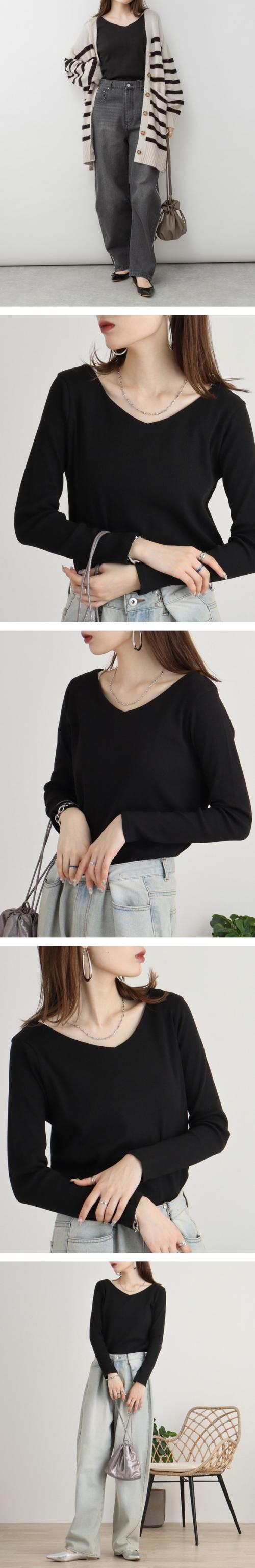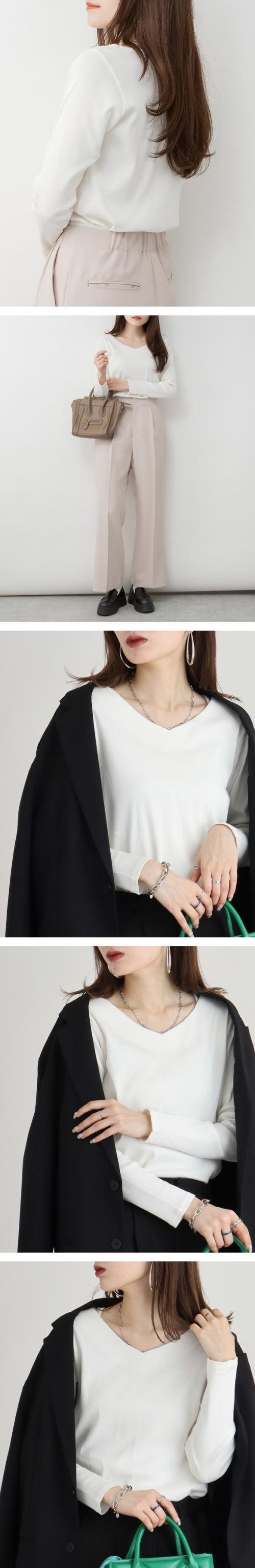Vネックのデザインが顔周りをすっきりと見せて洗練された印象を与えます。