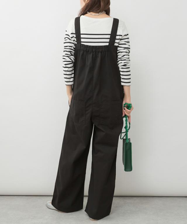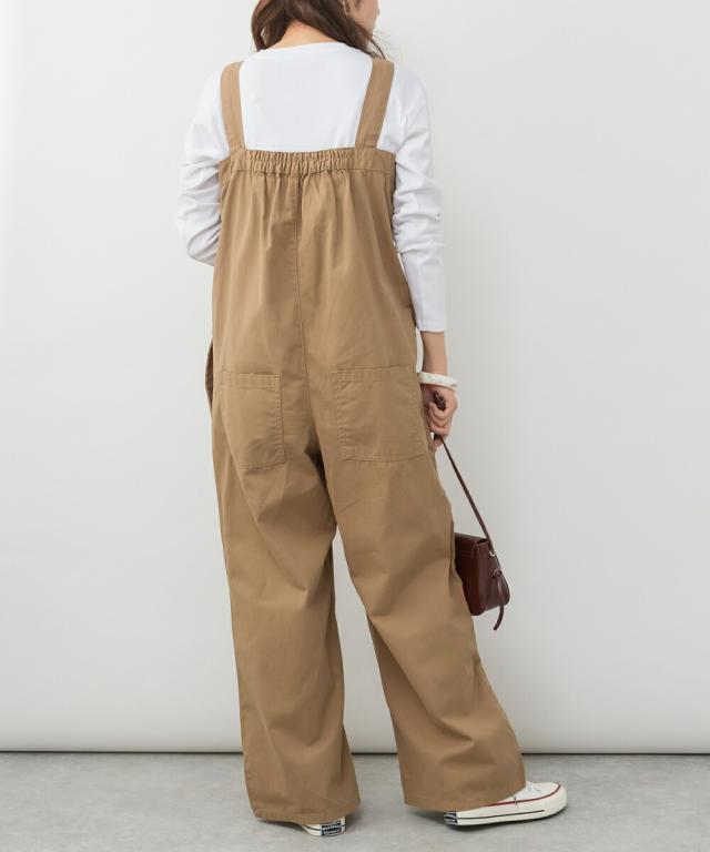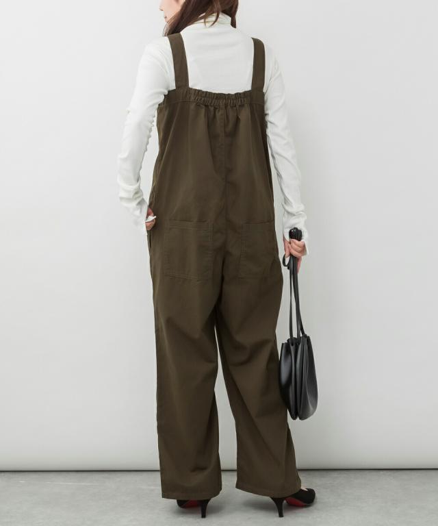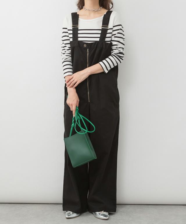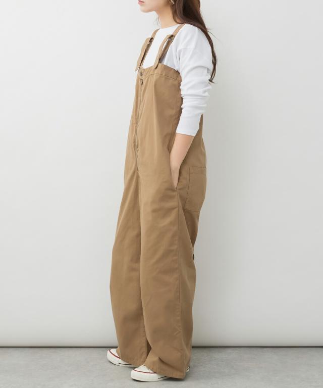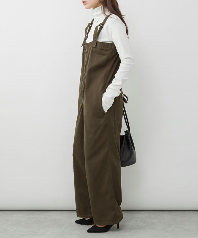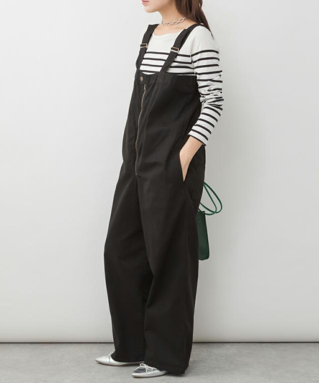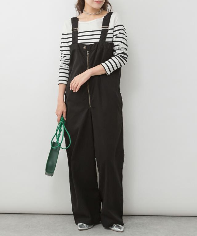 着脱しやすいようにするセンタージッパーをあえて見せることで、デザインポイントとしたハイウェストサロペットパンツ。