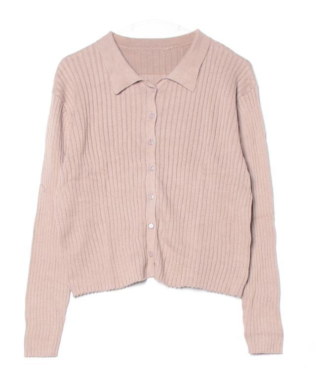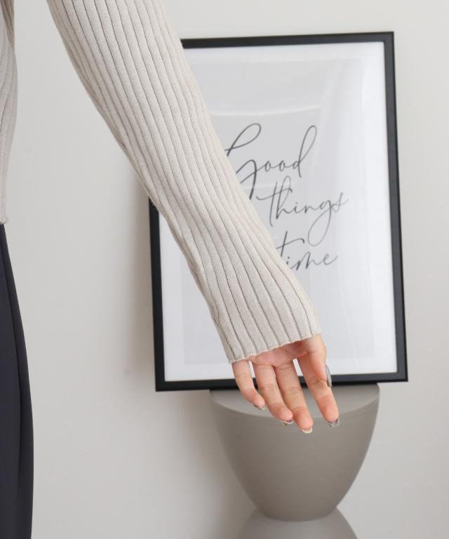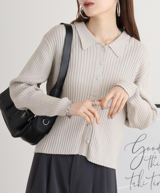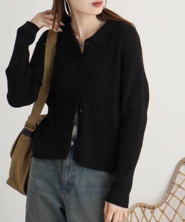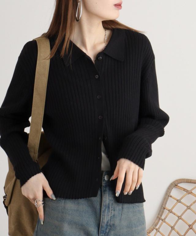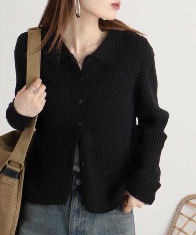 伸縮性に富んだリブ編み素材が体のラインを美しく見せ、クラシカルなポロ衿が洗練された印象を与えます。