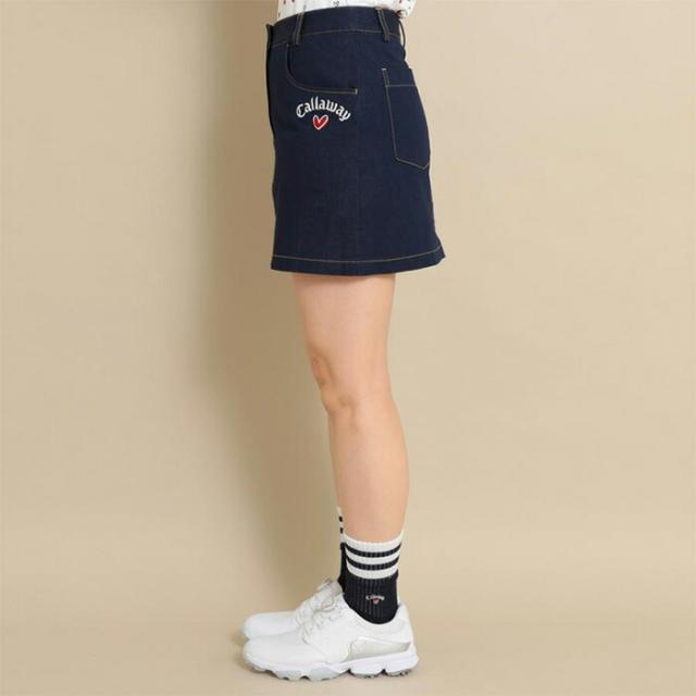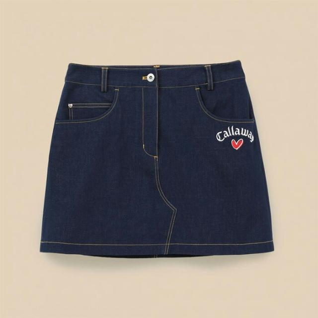 ポリエステルコットンのストレッチツイル素材使用したスカート。フロント左ポケット下の大きいLOVECallawayロゴ刺繍と右ポケットのハート型リベットがデザインポイント。ステッチワークでデニムスカート風にデザインし、カジュアルに着回しの効くアイテムに仕立てました。