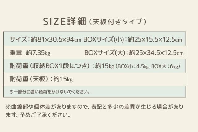 | 耐荷重 | カゴ大:(約)6kg カゴ小:(約)4.5kg 天板:(約)15kg 収納BOX1段につき:(約)5kg |