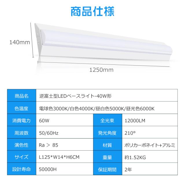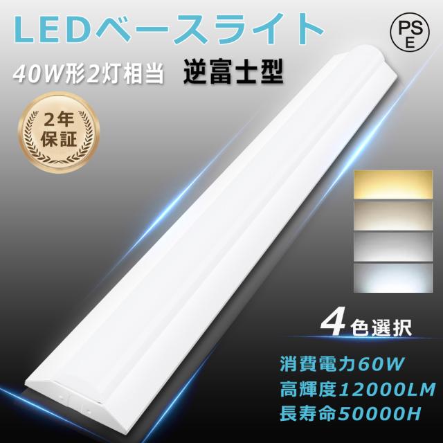 LEDベースライト 40W形 白色4000K 逆富士型 消費電力60W 高輝12000LM 省エネ LED蛍光灯 器具一体型 40w形 2灯相当 逆富士 直管 逆富士型蛍光灯 器具一体形 LEDベースライト 逆富士型 器具一体型 LEDキッチンベースライ 天井直付型 LED施設照明 天井用 LED照明器具