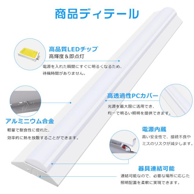 - 本製品は電源とLEDユニットが一体化した設計で、配線を接続するだけで簡単に使用できます。従来の蛍光灯とは異なり、別途インバーターや電源ユニットを取り付ける必要がなく、工事の手間を大幅に削減できます。取り付け後、すぐに点灯できるため、迅速に設置できます。この設計により、時間と手間を節約でき、さらにメンテナンスも簡単に行えます。