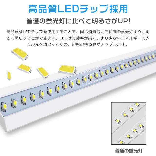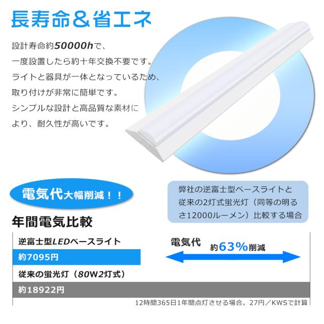 - 本製品は低費電力でありながら、明るく均一な高効率の発光を実現しています。省エネ設計により、電気料金の削減と環境への負荷軽減が期待できます。1台のLEDベースライトは、従来の蛍光灯2本分の明るさを提供します。
