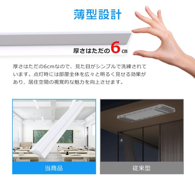 - 厚さはただの6cmなので、見た目がシンプルで洗練されています。点灯時には部屋全体を広々と明るく見せる効果があり、居住空間の視覚的な魅力を向上させます。
