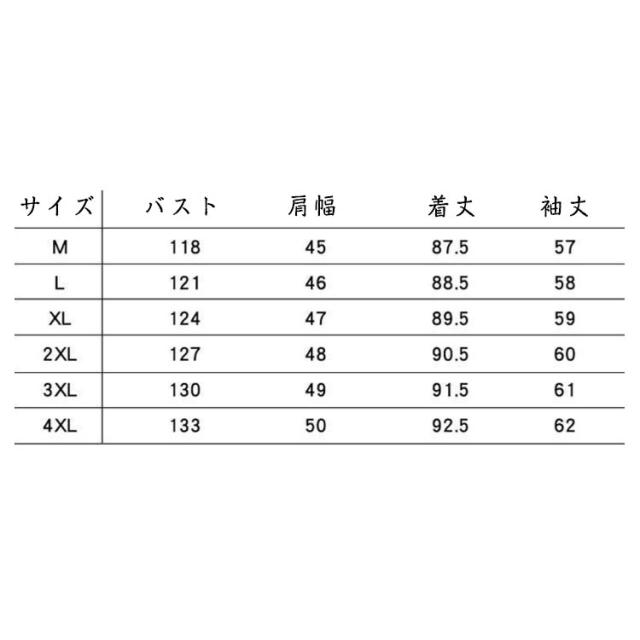 | サイズについての説明 | Mバスト118 肩幅45 着丈87.5 袖丈57 Lバスト121 肩幅46 着丈88.5 袖丈58 XLバスト124 肩幅47 着丈89.5 袖丈59 2XLバスト127 肩幅48 着丈90.5 袖丈60 3XLバスト130 肩幅49 着丈91.5 袖丈61 4XLバスト133 肩幅50 着丈92.5 袖丈62 |