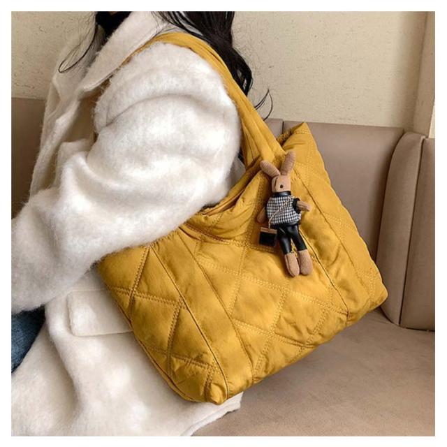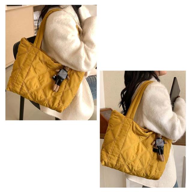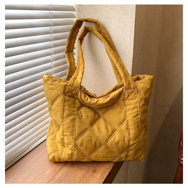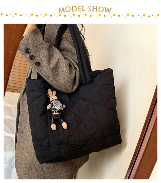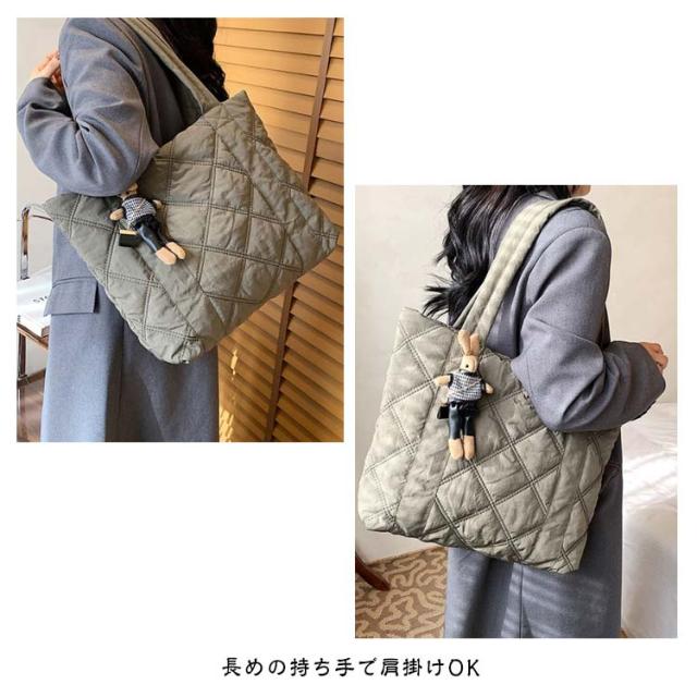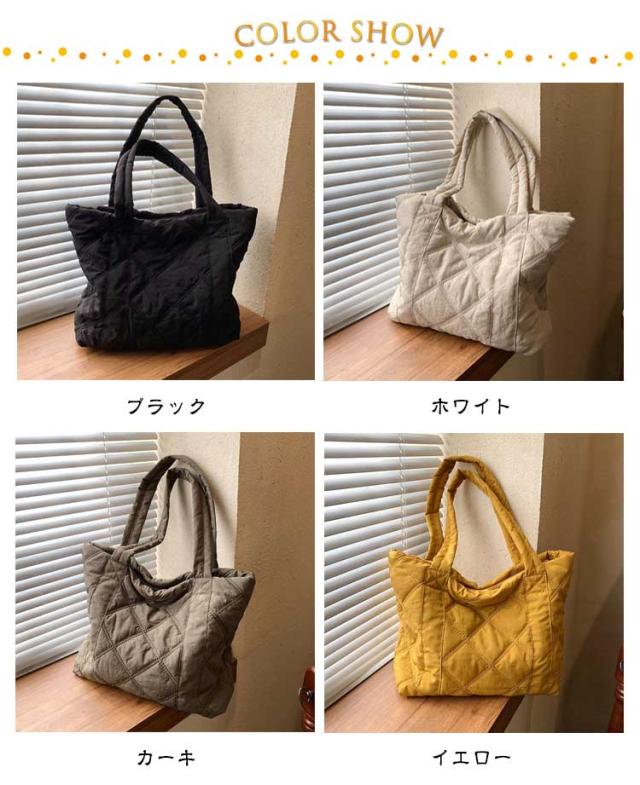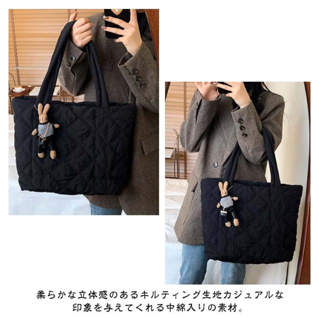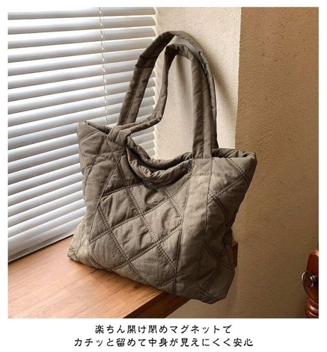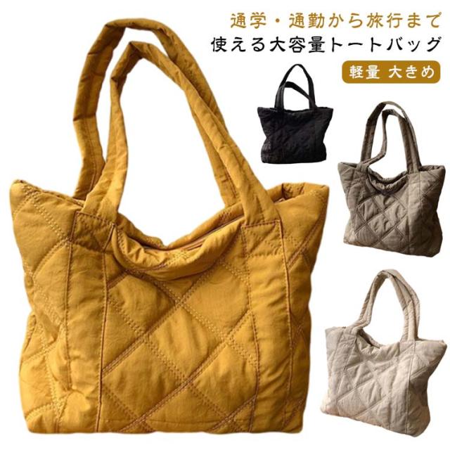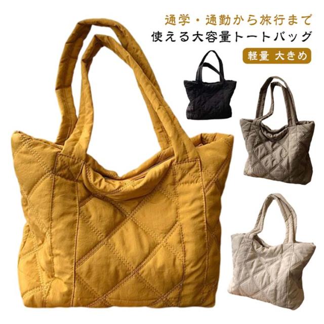 | 通学・通勤から旅行まで使える大容量トートバッグ 持ち歩きたいものをまとめて入れられる軽量トートバッグA4サイズの書類や、化粧ポーチなど大きめな荷物をマチが広く入れやすく便利に使えます。 収納しやすいマチ付き、インナーポケット付き 長めの持ち手で肩掛けOK 楽ちん開け閉めマグネットでカチッと留めて中身が見えにくく安心 柔らかな立体感のあるキルティング生地カジュアルな印象を与えてくれる中綿入りの素材。 | |