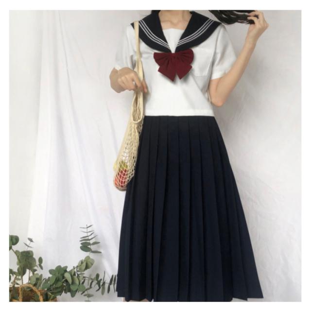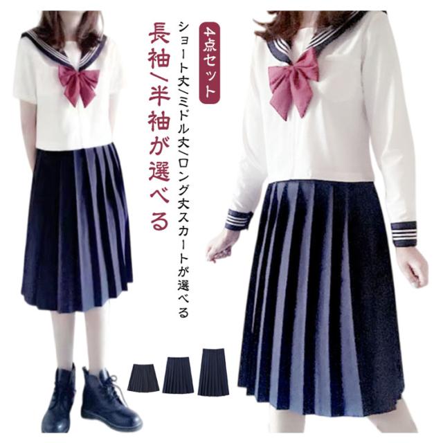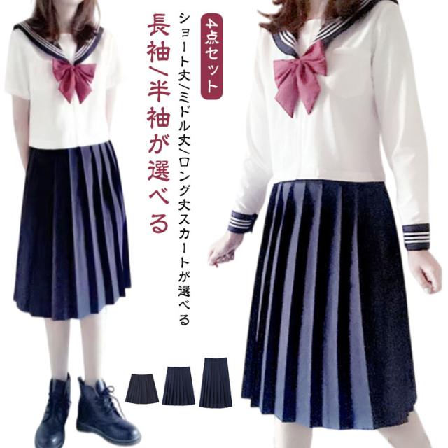 コスプレ 長袖 セーラー服 半袖 ロング丈 制服 セーラー服 4点セット セーラー服 学生服 かわいい スカート リボン 上下セット ロングスカート シャツ 女子高校生 JK制服 女子 高校生 学園祭 文化祭 ホワイト ネイビー 大きいサイズ