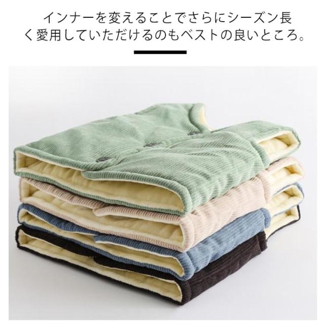 | 男女兼用コーデュロイ 裏起毛中綿ベスト。 表地は温かみのある柔らかいコーデュロイ素材を使用。 ふわふわ中綿入りなので防寒対策もばっちり。 フロントはスナップボタン仕様、着脱しやすい。 インナーを変えることでさらにシーズン長く愛用していただけるのもベストの良いところ。 | |