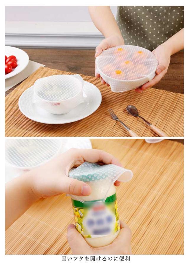 | 3種類/4枚入り 電子レンジ・冷蔵庫OK 繰り返し使えるエコアイテム伸びてくっつくシリコンラップ 液体もこぼれにくしい! 滑り止めとして カップの密封に 固いフタを開けるのに便利 | |