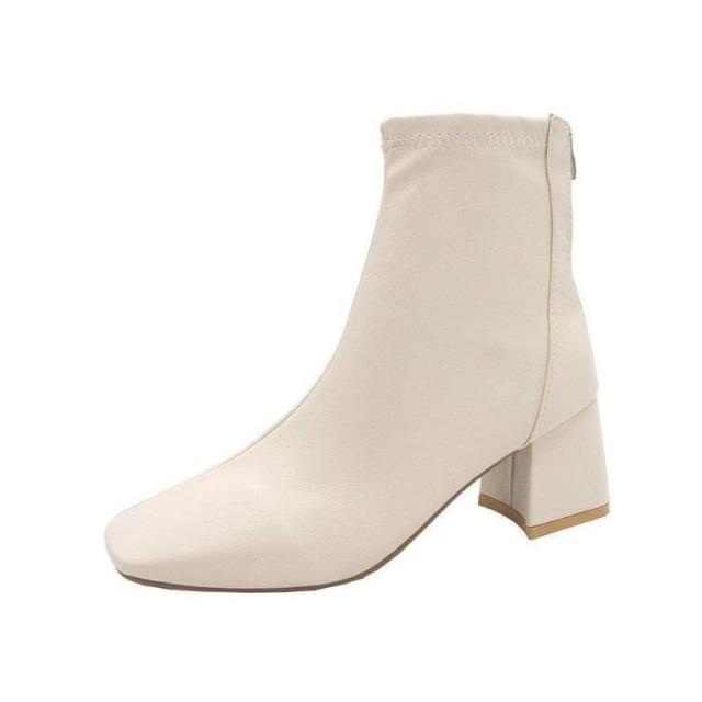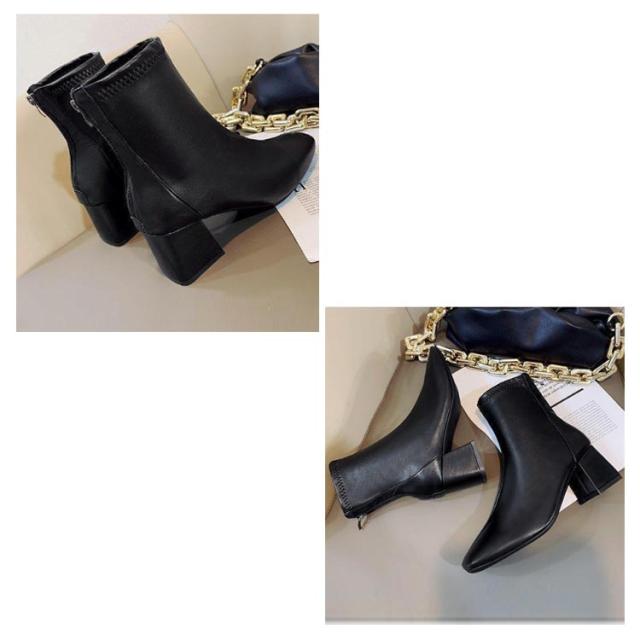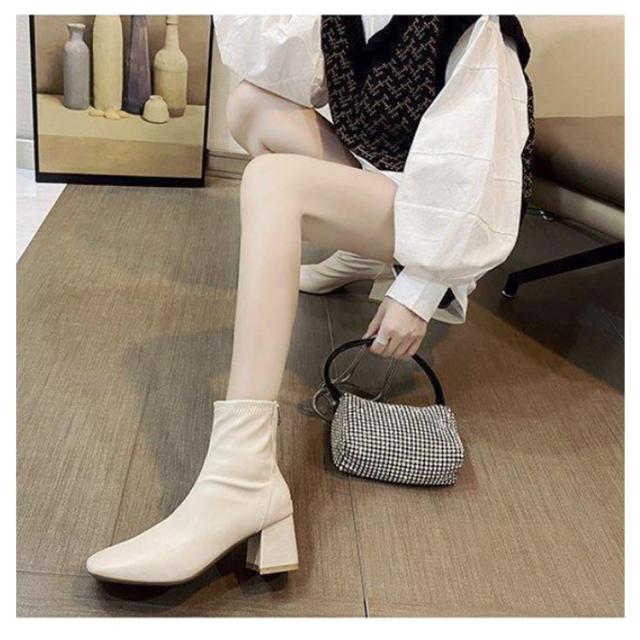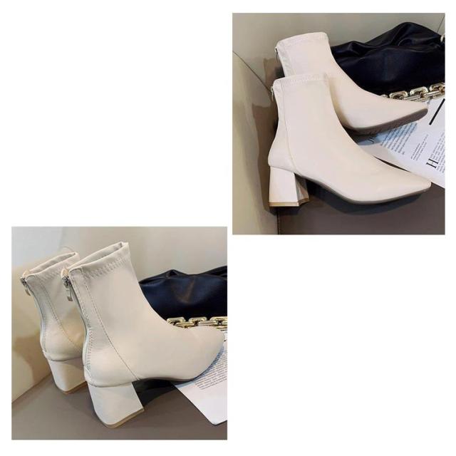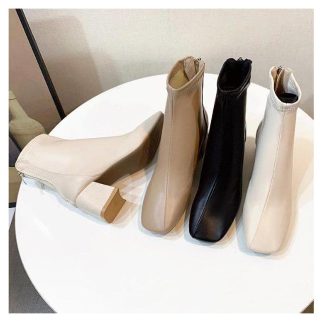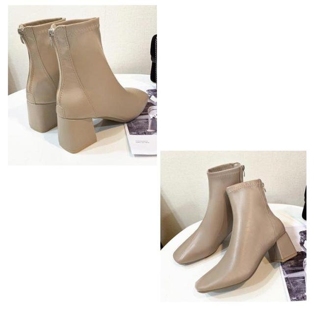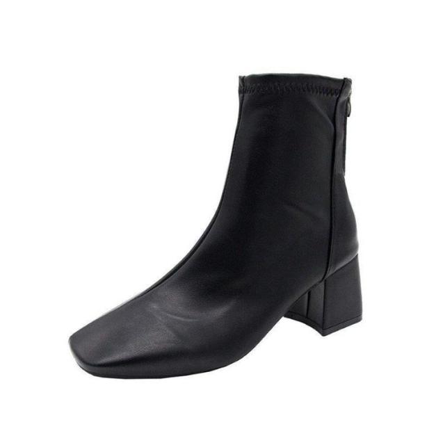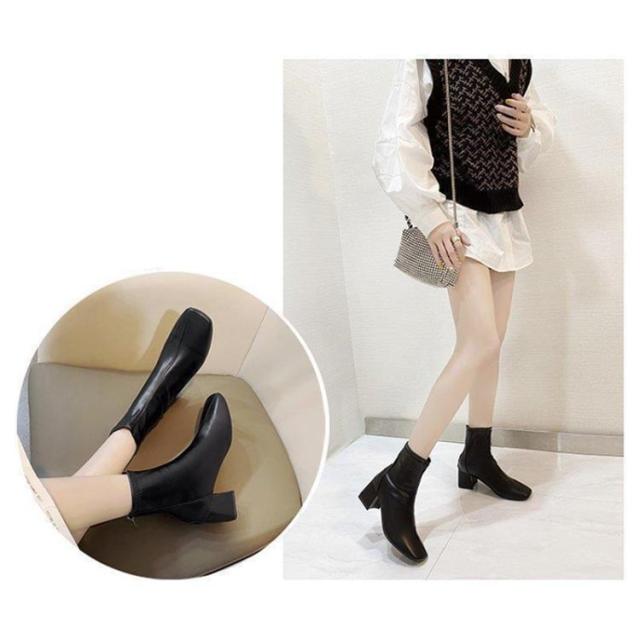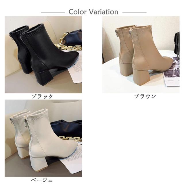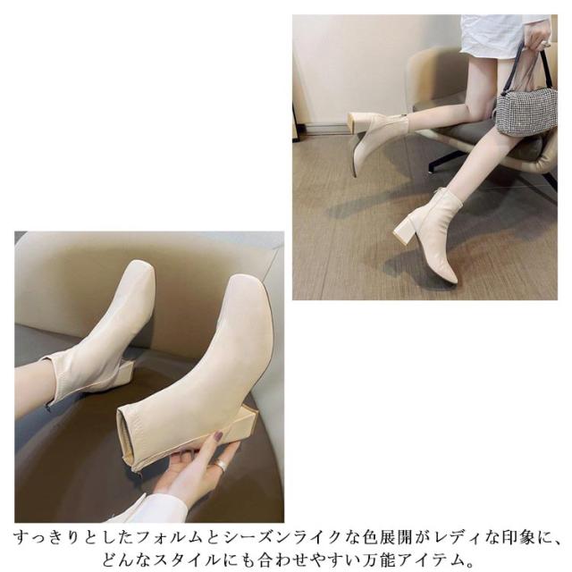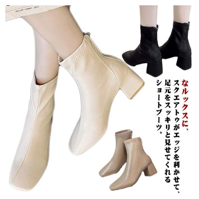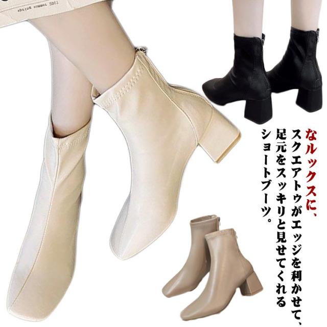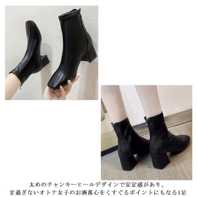 ショートブーツ 太めヒール スクエアトゥ ブーツ 合成皮革 レディース 靴 歩きやすい ブーティ 安定感抜群 美脚 疲れにくい チャンキーヒール オフィス 通勤 キレイめ 春 秋 冬