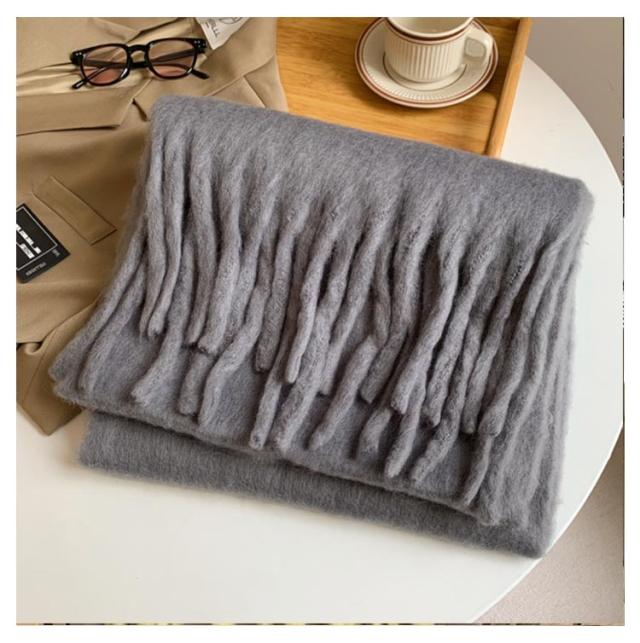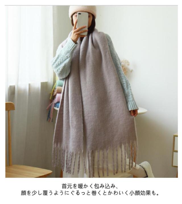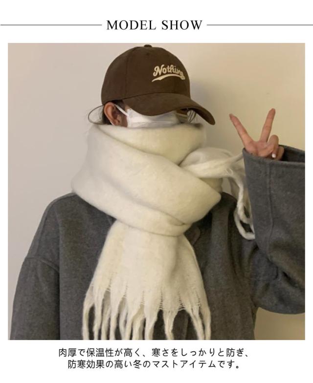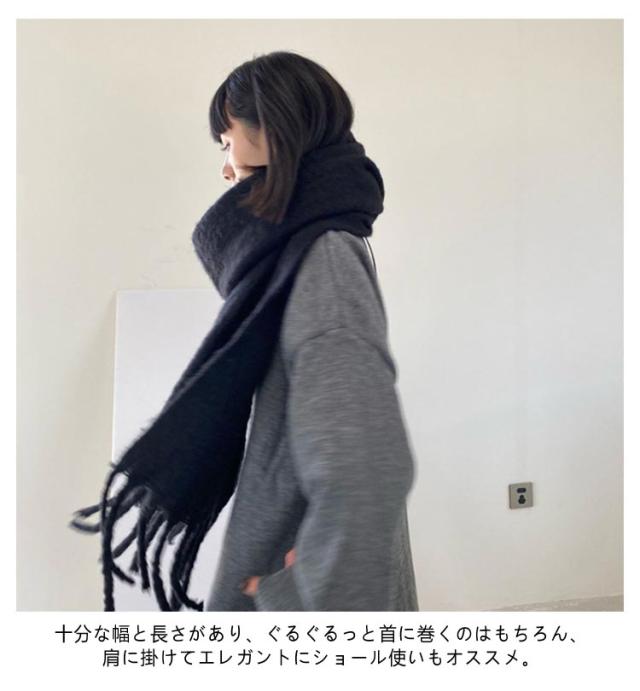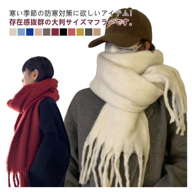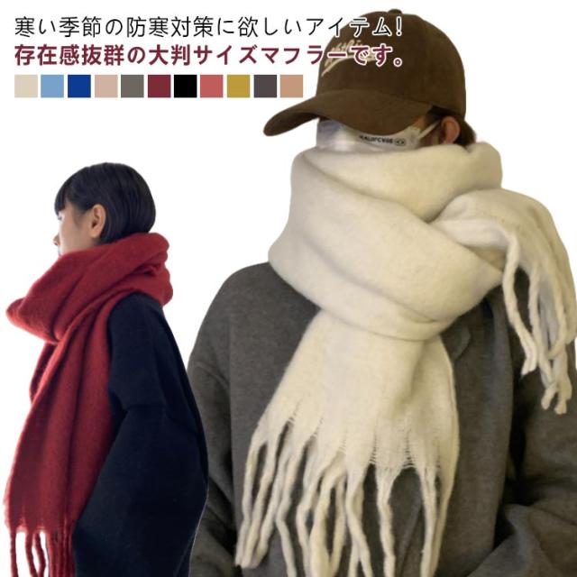 | 寒い季節の防寒対策に欲しいアイテム!存在感抜群の大判サイズマフラーです。 肉厚で保温性が高く、寒さをしっかりと防ぎ、防寒効果の高い冬のマストアイテムです。 首元を暖かく包み込み、顔を少し覆うようにぐるっと巻くとかわいく小顔効果も。 十分な幅と長さがあり、ぐるぐるっと首に巻くのはもちろん、肩に掛けてエレガントにショール使いもオススメ。 通勤、通学、飲み会、デートやアウトドアなど様々なシーンに活躍できます。 | |