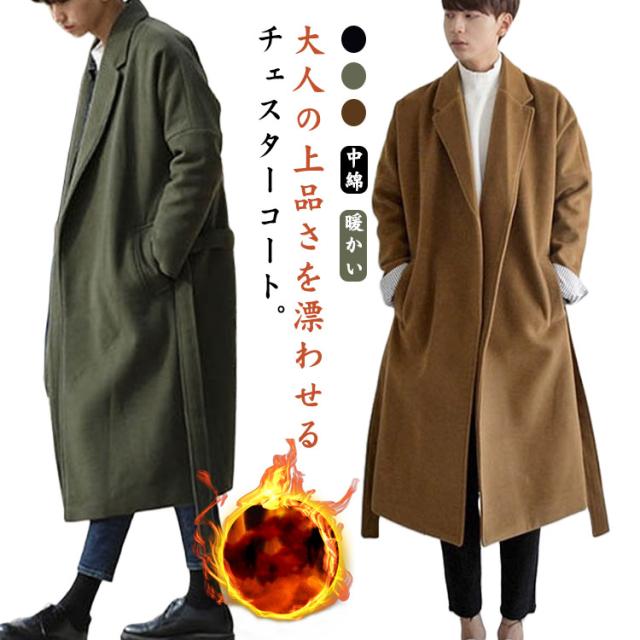 防寒 カジュアル 裏地付き チェスターコート 無地 暖かい メンズ 綿入り 厚手 ロングコート ロング丈 アウター ベルト付き ロップショルダー 無地 大きいサイズ ビジネス 中綿コート 通勤 通学 ゆったり