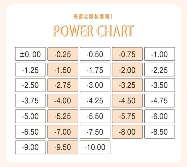 | 度数 | ±0.00、-0.25〜-6.00(0.25Dステップ) -6.50〜-10.00(0.50Dステップ) |