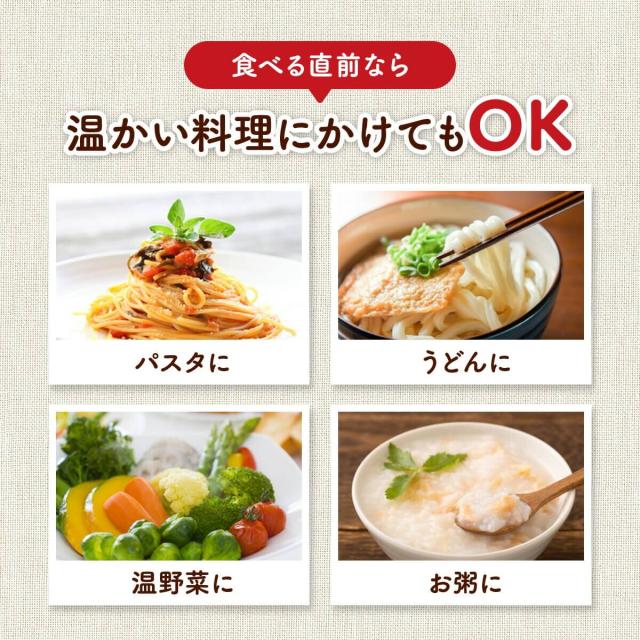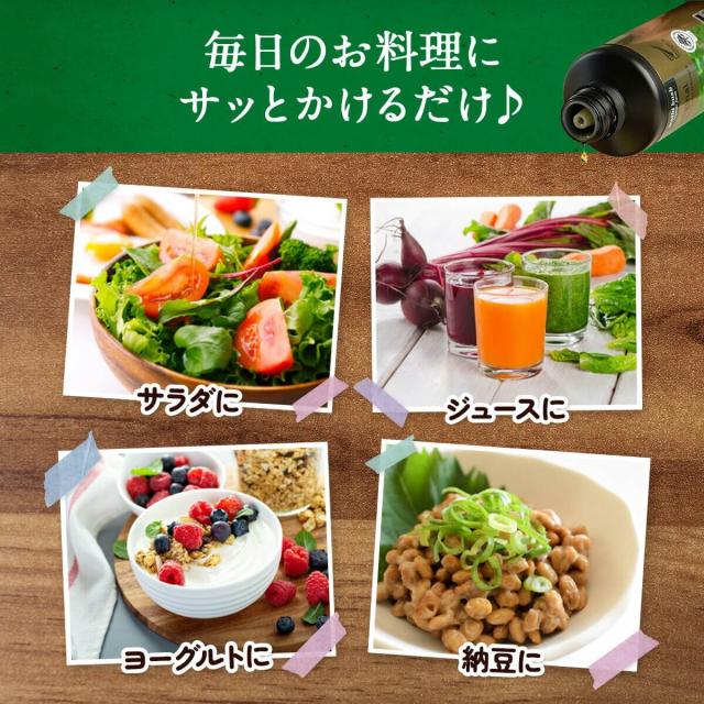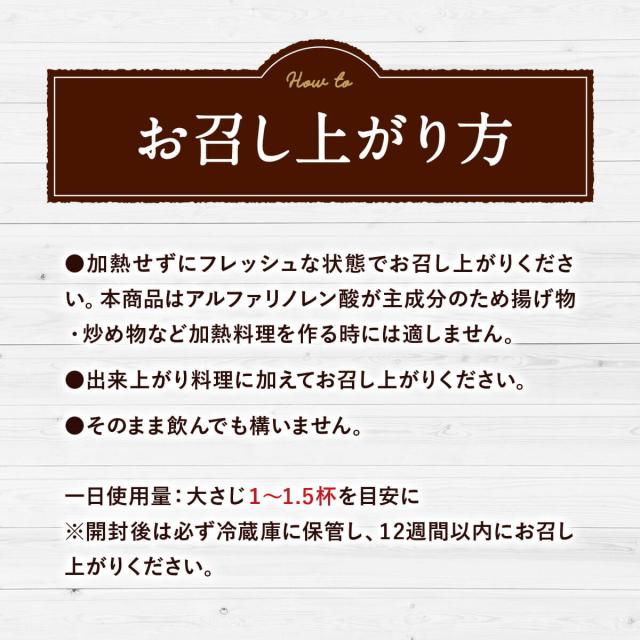 お召し上がり方:毎日のお料理にサラっとかけるだけ♪加熱せずにフレッシュな状態でお召し上がりください。本商品はアルファリノレン酸が主成分のため揚げ物・炒め物など加熱料理を作る時には適しません。出来上がり料理に加えてお召し上がりください。そのまま飲んでも構いません。