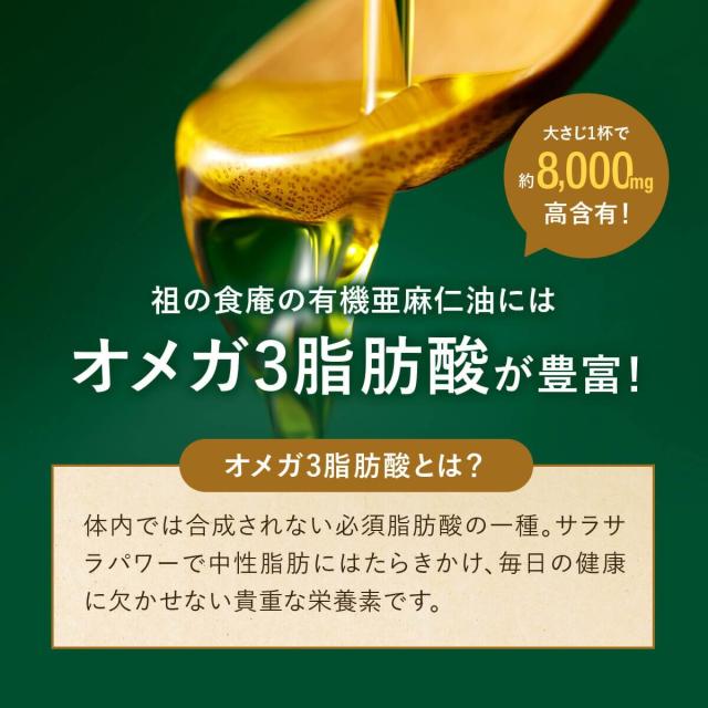 ニュージーランド産の希少なオーガニック亜麻仁油(エクストラバージン)をご紹介!祖の食庵の亜麻仁油はオメガ3脂肪酸がたっぷりです。体内では合成されない必須脂肪酸の一種で、サラサラパワーで中性脂肪にはたらきかけ、毎日の健康に欠かせない貴重な栄養素です。こだわりの低温圧搾・未精製という、品質劣化を避けるため手間隙をかけた製法で油を抽出。また、亜麻仁油が本来持っている栄養素を十分に摂取することのできる、未精製の黄金油を使用しています。国際的にも認知されている有機JAS認証を取得。無農薬・有機栽培(オーガニック)で作られているので、農薬の心配もなく、安心安全の亜麻仁油です。
