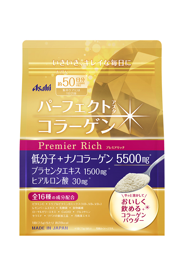 「パーフェクトアスタコラーゲン」ブランドは、毎日の習慣として摂りたいコラーゲンに、美容系成分をプラスしたコラーゲンシリーズです。パウダー、パウダープレミアリッチ、ドリンクには、ヒアルロン酸、レモンバームエキスを配合。2009年の発売以来、コラーゲン独特の風味を感じさせないおいしさや、低分子コラーゲンと一緒に美容系成分も摂取できる商品設計が多くの方から支持されています。