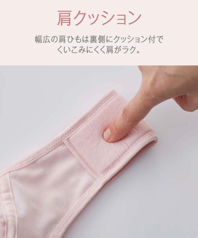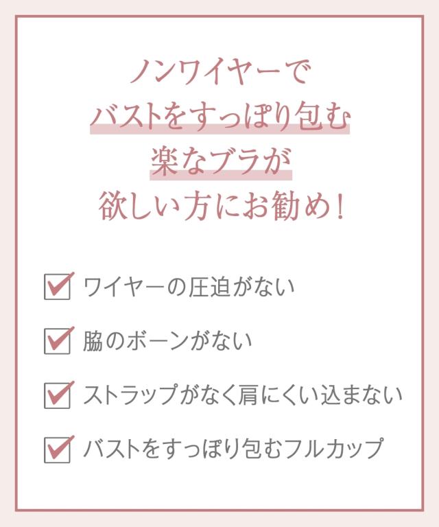 【おすすめポイント】 ・ワイヤーの圧迫感がない ・脇のボーンがない ・ストラップがなく肩に食い込まない ・バストをすっぽり包むフルカップ 【こんな方におすすめ】 ・ノンワイヤーだけと胸をしっかり整えたい ・肩ひもの負担を軽減したい ・背中のお肉の段差を軽減したい 【商品特徴・機能】 ・幅広の肩ひもの裏側は一部クッション付でくいこみにくく肩がラク ・カップはやわらかく通気性の良い綿を使用、ふんわり優しくフィット ・カップは縦接ぎ構造の切り替えでバストトップがとがりにくい丸いシルエット ・4本の伸び止めテープでボーン無しでもしっかりホールド ・バック部分は身生地二重仕立て&脇背中高設計でお肉段差をカバー
