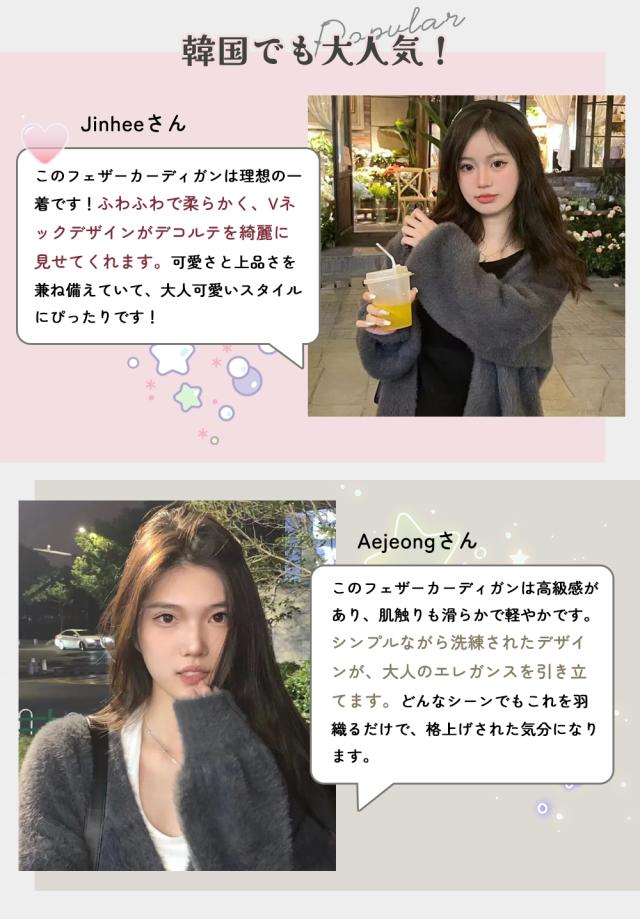 このフェザーカーディガンは、柔らかく軽やかな着心地が特徴で、まるで雲に包まれているような温かさを感じられます。Vネックのデザインがデコルテを美しく見せ、大人っぽさと可愛らしさを兼ね備えています。デイリーのお出かけにも、おうち時間にもぴったりなアイテムです。