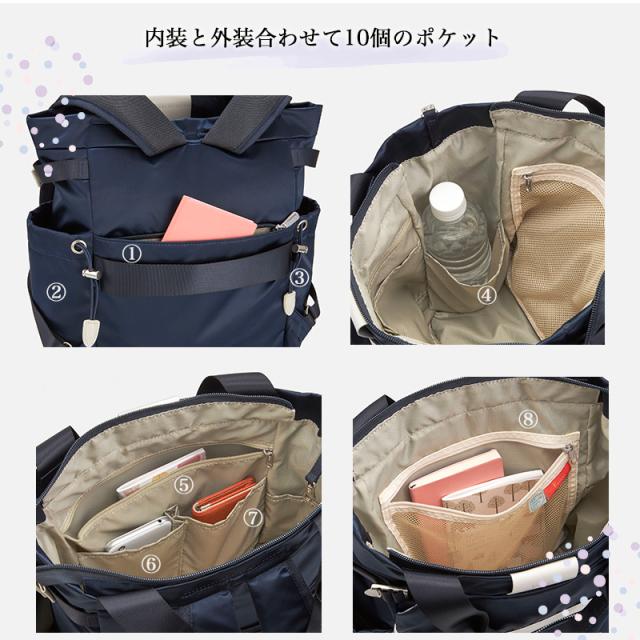 | 仕様 | 【内側】 ・ベタ付けポケット×2 ・ファスナーポケット×1 ・メッシュファスナーポケット×1 【外側】 ・サイドポケット×2 (ペットボトル収納可能) ・フロントポケット×1 (ベタ付けポケット付き) ・背面ポケット×1 |