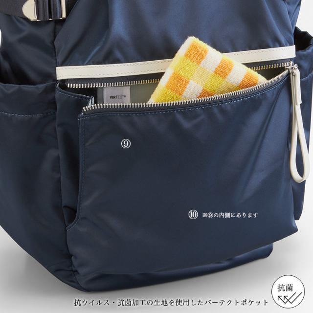 厚めのハンカチなども入る抗菌・抗ウイルス加工生地のフロントポケット。