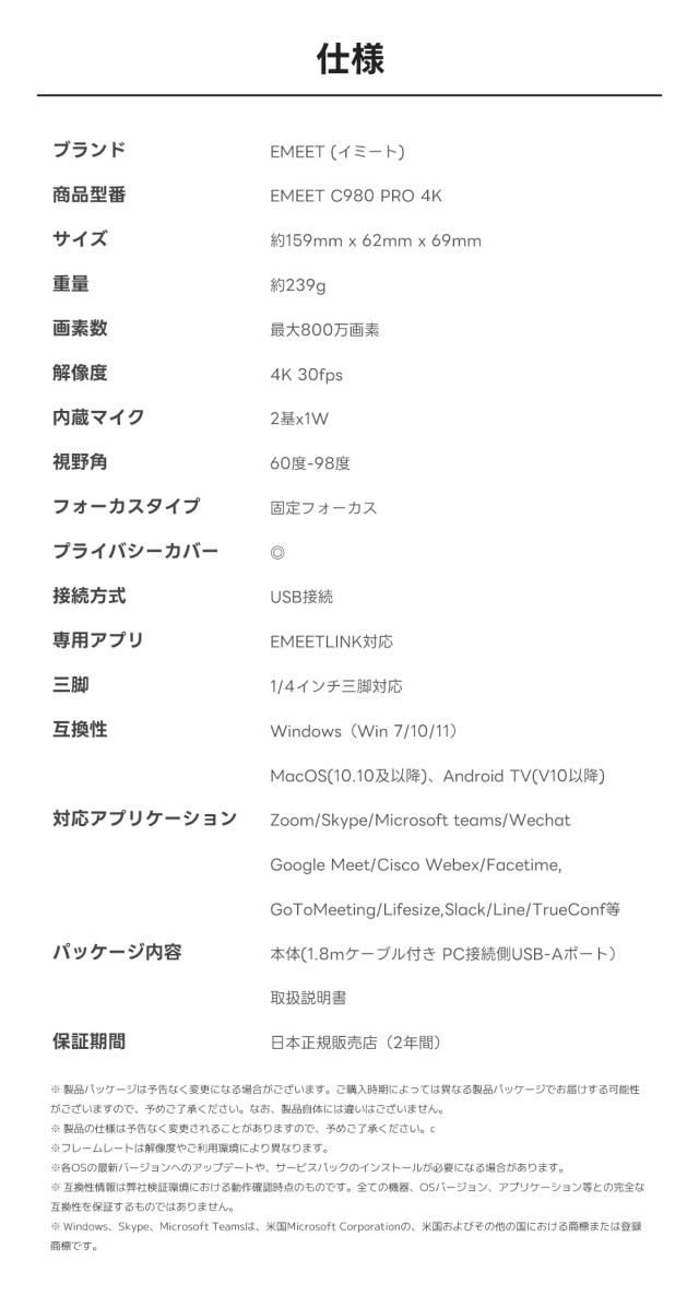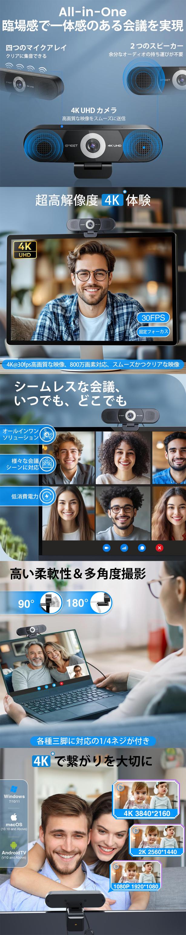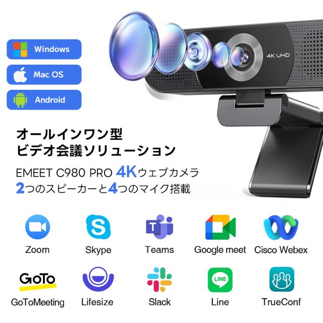 【年末年始セール 20%お得(15%OFF+5%ポイント)| 新発売|日本正規販売店|2年保証】 EMEET オールインワン 4K WEBカメラ C980Pro4k 800万画素 4つマイク内蔵 デュアルスピーカー 広角 固定フォーカス 30fps 視野角60°-98° プライバシーカバー付